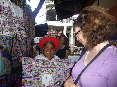 Santiago purchases nearby - a folk art rooster (20Q = $2.50), a